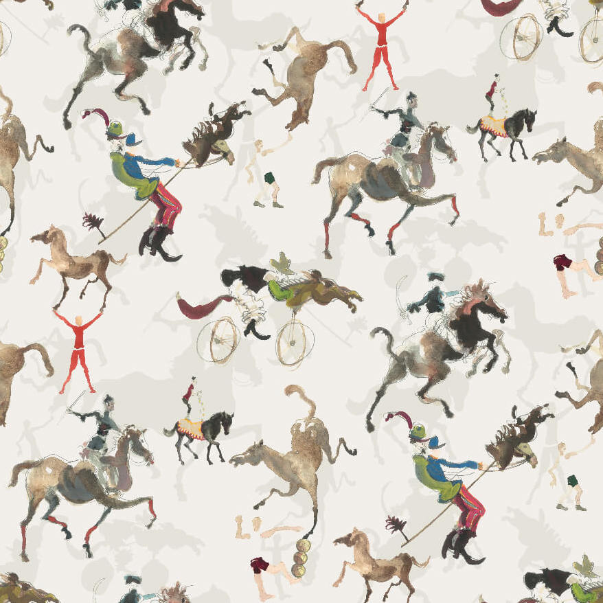 Het Pierre Frey Jour de fete behang is van paarden die in alle richtingen galopperen. Gaël Davrinche is de schilder die deze feestdag animeerde.
